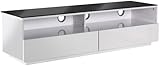; UK-CF New York White TV Cabinet; High Gloss White Finish; Low Level Design; Smoked Black Glass Top Surface; Wide Central Shelf; Two Gloss Fronted Large Drawers; Cable Management System; Suitable for televisions up to 55"; Beam Thru Doors - Remot Friendly Technology; Built-In Airflow Ventilation; Dimensions: (H) 42cm x (W)150cm x (D) 42cm; 1-year manufacturers warranty ; Fully Assembled