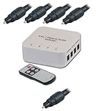 Ex-Pro Professional package :- SPDIF Digital - 4 Way Remote TosLink Digital Optical Audio Switch. [Switch between devices, PS3, Virgin, Sky, Xbox 360, DVD, Blueray player etc..]. This very compact switch allows you to connect two digital optical Toslink sources to a single optical TosLink (SPDIF) input on your HD TV, AV amplifier, Hi-Fi or home cinema system. A simple switch control allows you to select the source device. Ideal for use with PS3, Xbox 360, Gaming, PC, Blueray, CD/DVD Player, Set top box, PC etc. and saves on wear and tear of constant plugging and unplugging of cables. 2 Way TosLink Digital Optical Audio Switcher. Supports cables distances of up to 5m in (for each input) and 5m out. Input ports: 4 x TosLink (Optical Fibre). Output port: 1 x TosLink (Optical Fibre). Supports uncompressed 2-channel LPCM (Linear Pulse Code Modulation) digital audio signal output. Supports compressed 2-channel and multi-channel Dolby and DTS audio signals. Includes 5V DC multi country power supply. Dimensions: 95 x 85 x 35mm (WxDxH). Ex-Pro 2 year warranty on switch.